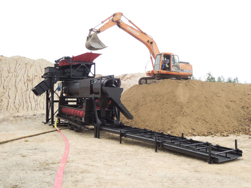 可采用挖掘機、鏟車、輸送機上料、也可定制為沙泵或翻斗車上料的料斗。料斗可配套格篩,將大石塊廢料隔出,以免對篩造成傷害。料斗可配套振動給料機、使礦料在進入滾筒式均勻、不間斷。小型淘金設(shè)備