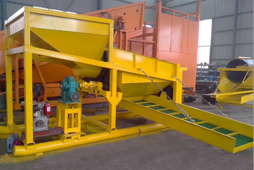 一種小型沙金機械 小型的沙金機械有移動式的,有滾筒式的,這種在沙金礦開采中移動比較方便,篩分、洗礦、黃金回收作用一個不少,只是產量稍微小了點。可以采用小型的工程機械來配合給料,采用小型的水泵來供水。這種設備生產成本低。