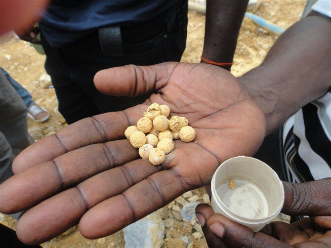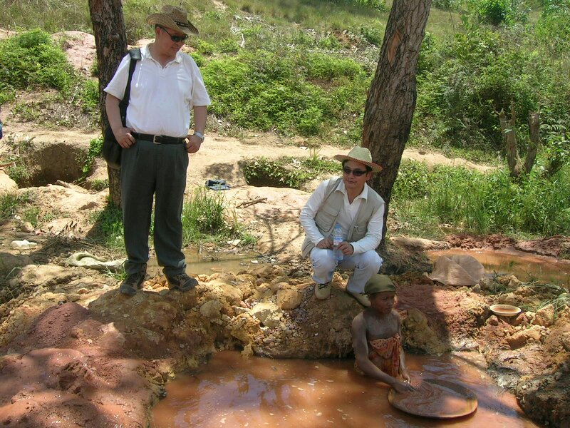 工程師考察沙金礦地形記錄:礦區(qū)在兩溝交匯處,四周山脈隆起,底部形成一個(gè)長約1km寬0.4km長形的小盆地,在兩溝交匯口,有近期沉積形成的氧化礦,伴有石英黃鐵礦化轉(zhuǎn)石和部分單質(zhì)分離的自然金,富集在紅土和火山碎屑巖中,分布在靠近山坡處河床位置的上層。屬洪積型破碎賦存河床表面的分散單質(zhì)自然金。 兩溝旱季無流水,雨季會有山洪,屬于季節(jié)性河流。沙金船